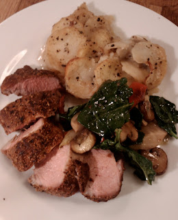 Rose Prince, in her aforementioned book reckons that due to it’s richness, you don’t need to serve as much veal as you would beef, about 150g per portion being plenty, which turned out to be just as well, as my friends Darren and Christabel, having just moved in around the corner from us and being, as yet, without kitchen facilities came round for dinner at short notice, and the two goose skirts I’d brought home, which I’d thought might be a bit over generous for two, would, by that maths just about stretch four ways. To make sure nobody would go hungry I made a substantial warm salad of roasted butternut squash and lentils and baked a big dish of boulangere style potatoes, with onions and beef stock, to serve alongside.